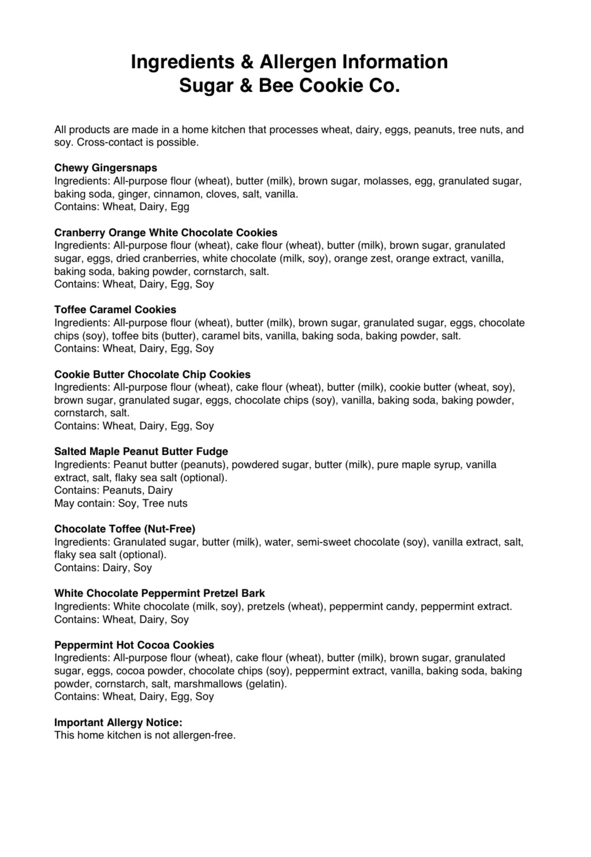 All items are made in a home kitchen operating under MN Cottage Food Laws and not subject to state inspection.